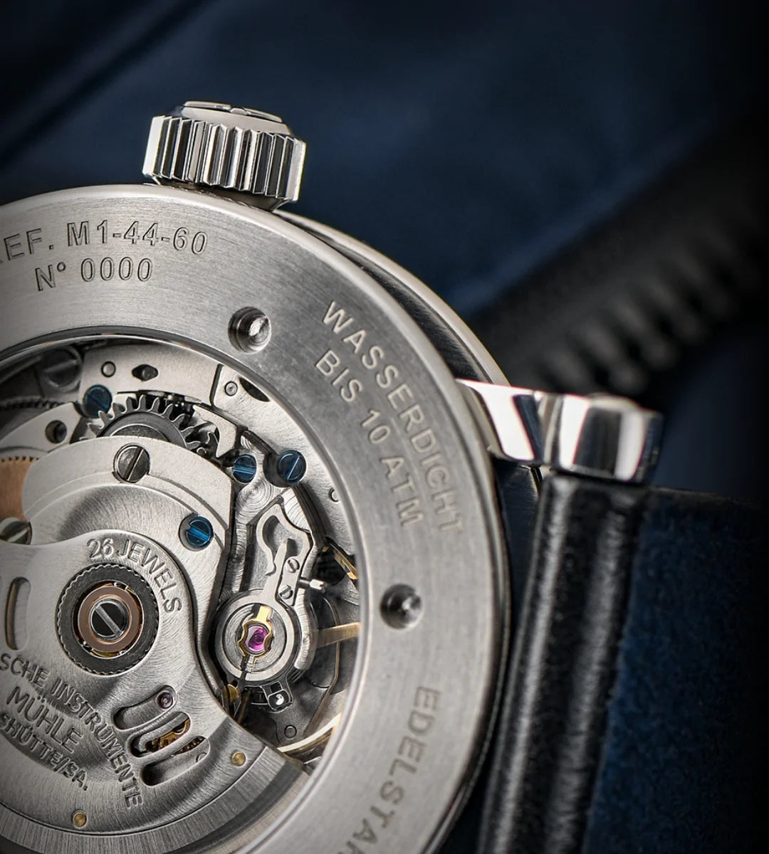 Entdecken Sie das Modell M1-25-72-CB von Mühle Glashütte - Eine Kreation, die Eleganz mit technischer Meisterschaft vereint.